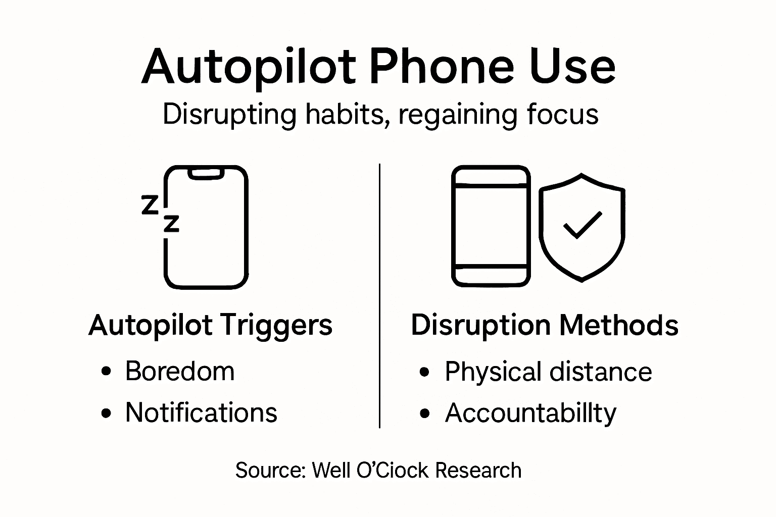 The distinction matters because autopilot phone use creates a specific problem: your phone becomes a default reflex rather than a tool. Breaking this cycle requires interrupting the automatic behavior itself, not just limiting total screen time.