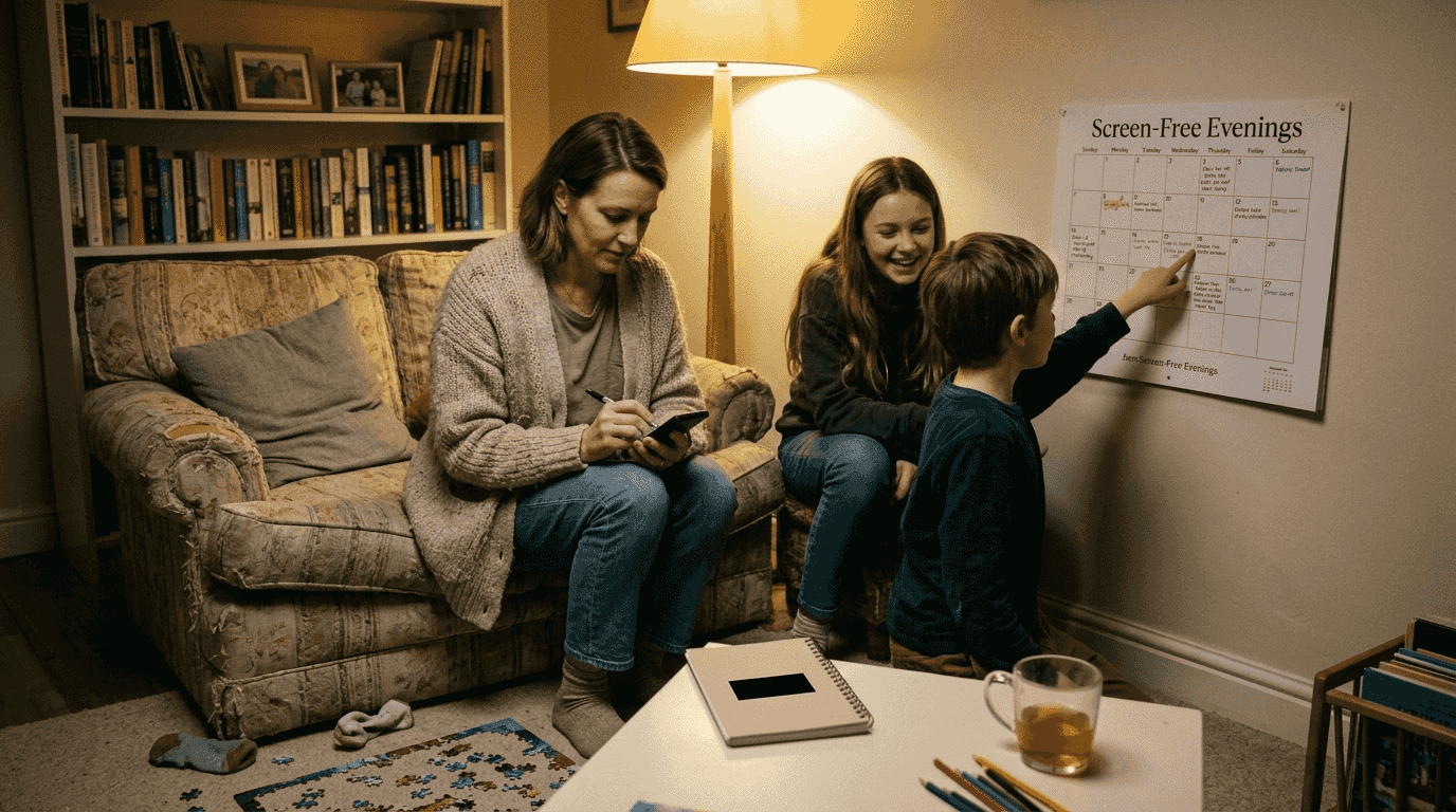 Model healthy phone habits yourself. Children notice when parents scroll during dinner but forbid kids from doing the same. Your behavior sets the real standard, regardless of stated rules.