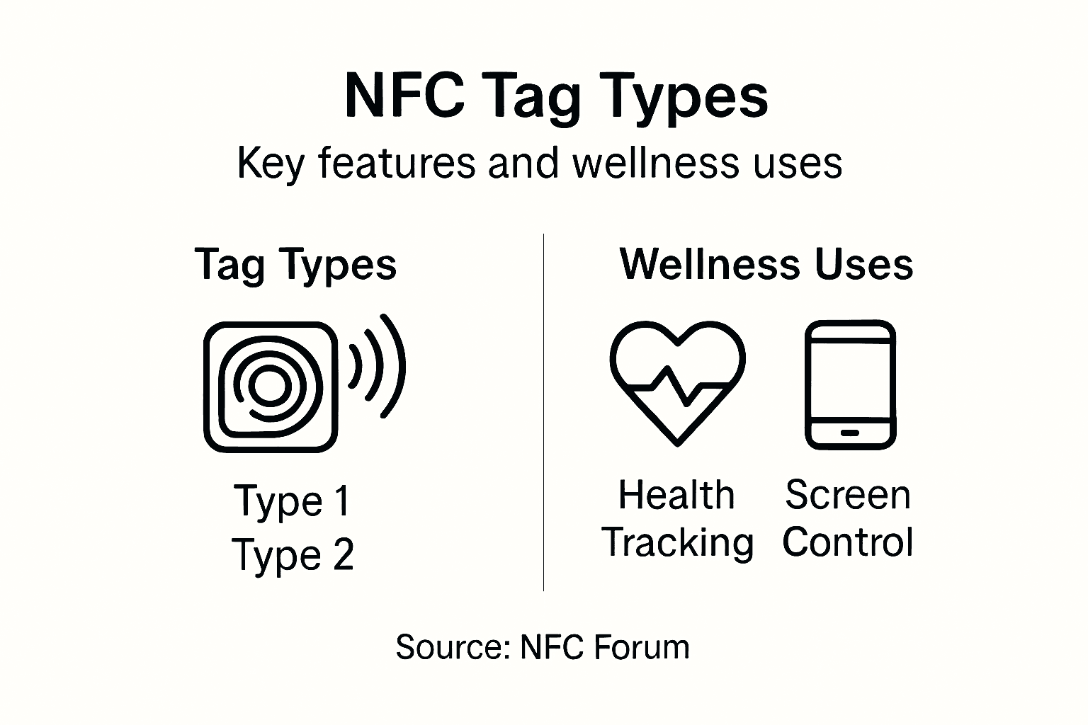 There are five types of NFC tags, each designed for specific use cases, such as Type 1 for simple tasks, Type 4 for secure payments, and Type 5 for extended read range, catering to various needs within digital wellness.