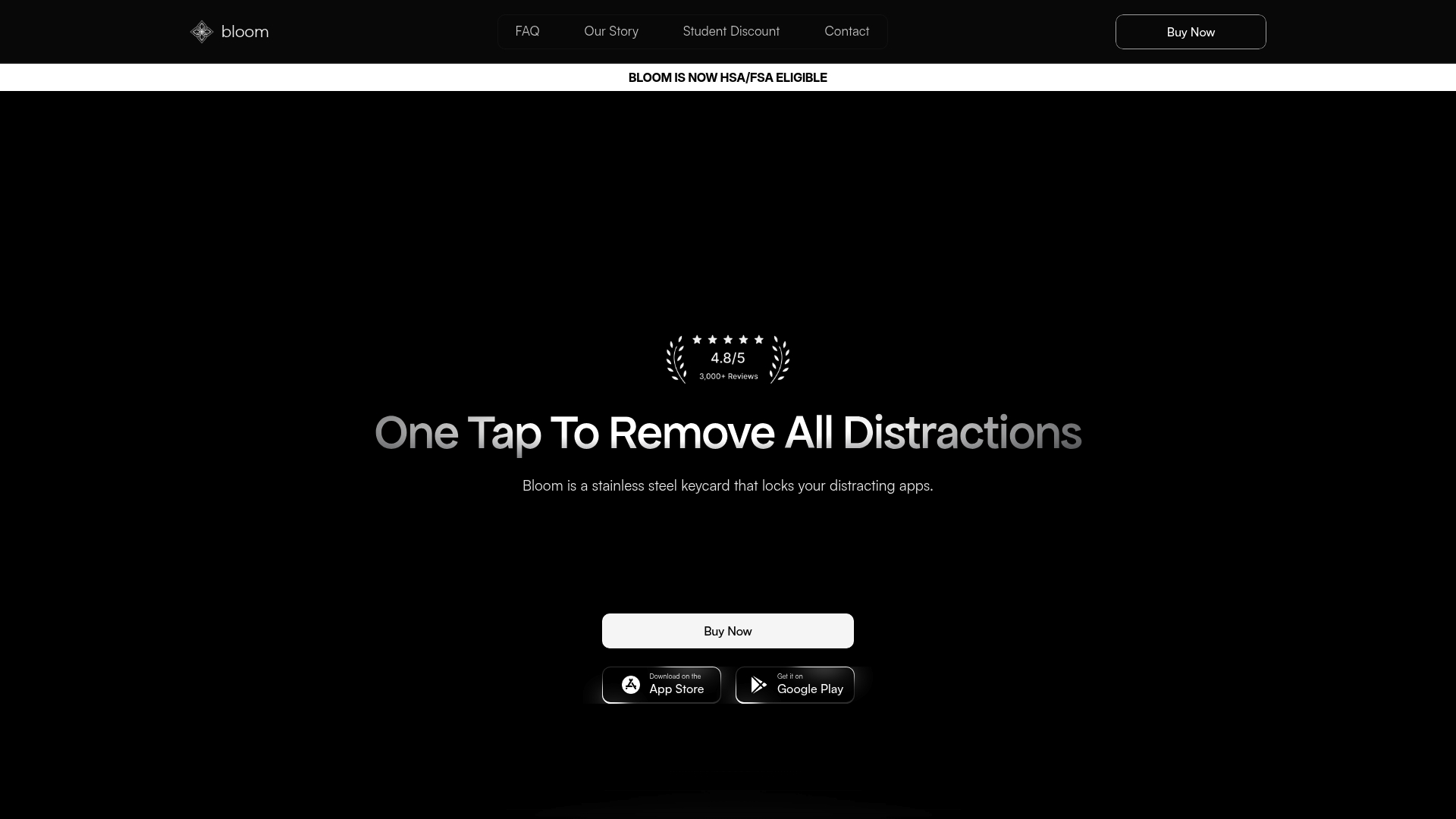 Bloom combines a metal keycard with a companion iOS/Android app to enforce focus sessions, schedules, and parental controls. The system blocks apps and websites and uses a physical tap to start and end focus periods.