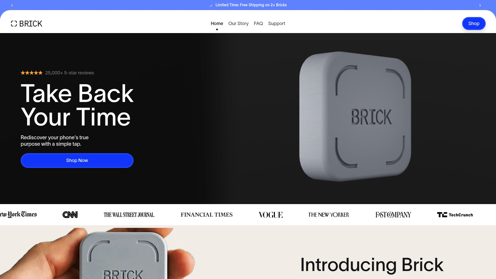 The Brick is a physical device that blocks selected apps and websites to reduce phone distractions and help you regain control of attention. It forces a tactile step to unblock apps so you stop scrolling on autopilot.