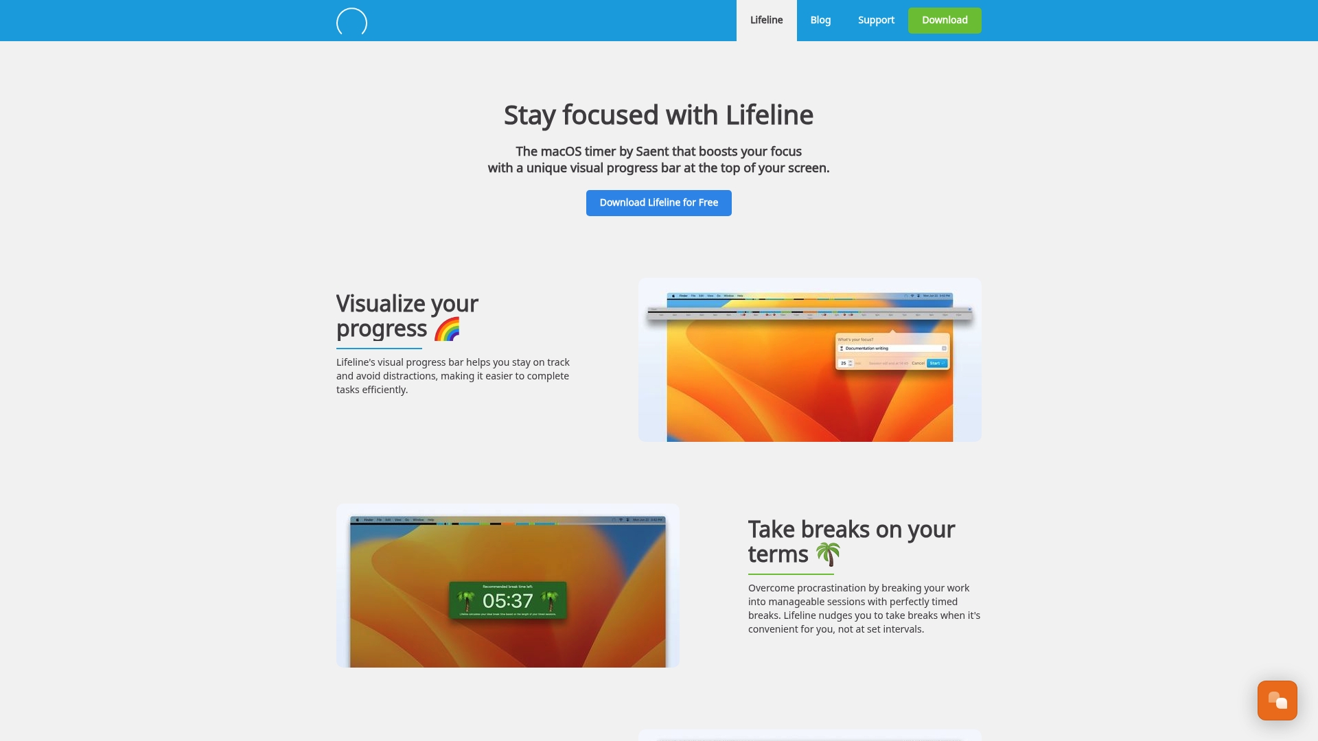 Lifeline by Saent is a macOS timer app that helps you build sustained attention with a visual progress bar and gentle break nudges. It is simple and unobtrusive, ideal for parents who need reliable focus tools between chores, school runs, and work.