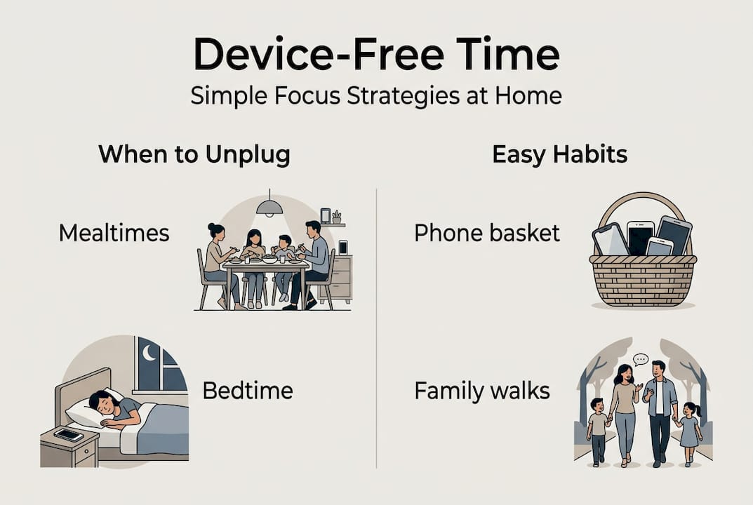 Device-free time is highly practical for parents and supports healthier family interactions. It models good digital habits for children more effectively than rules alone. Start with specific activities like meals or bedtime routines where full presence matters most. You don't need to be completely unreachable; scheduled device-free periods work well alongside availability during other times.